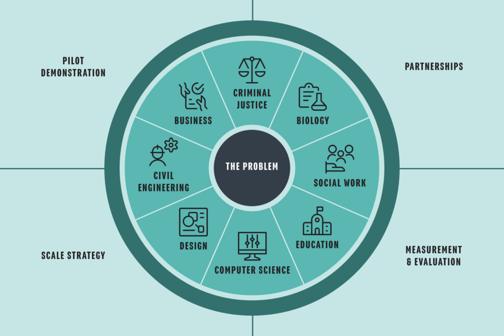 Our vision for the future of higher education is one where teaching and learning is oriented around the practical act of solving complex problems. Students from multiple disciplines will take courses that focus on specific, well-defined societal challenges. Courses are offered across the entire cycle of problem definition, solution development, testing, and measurement and evaluation.